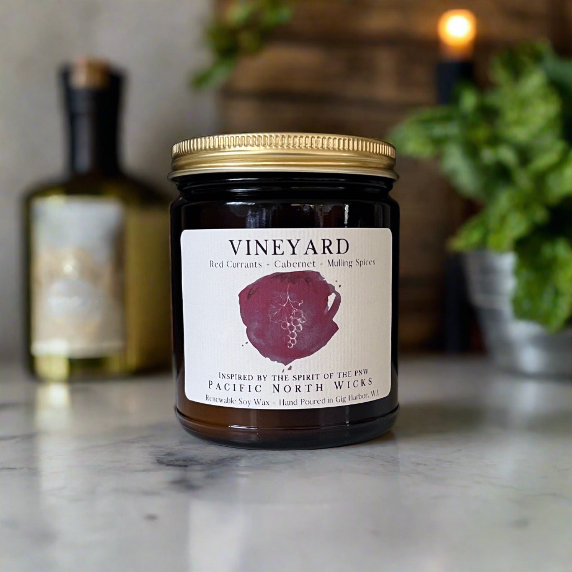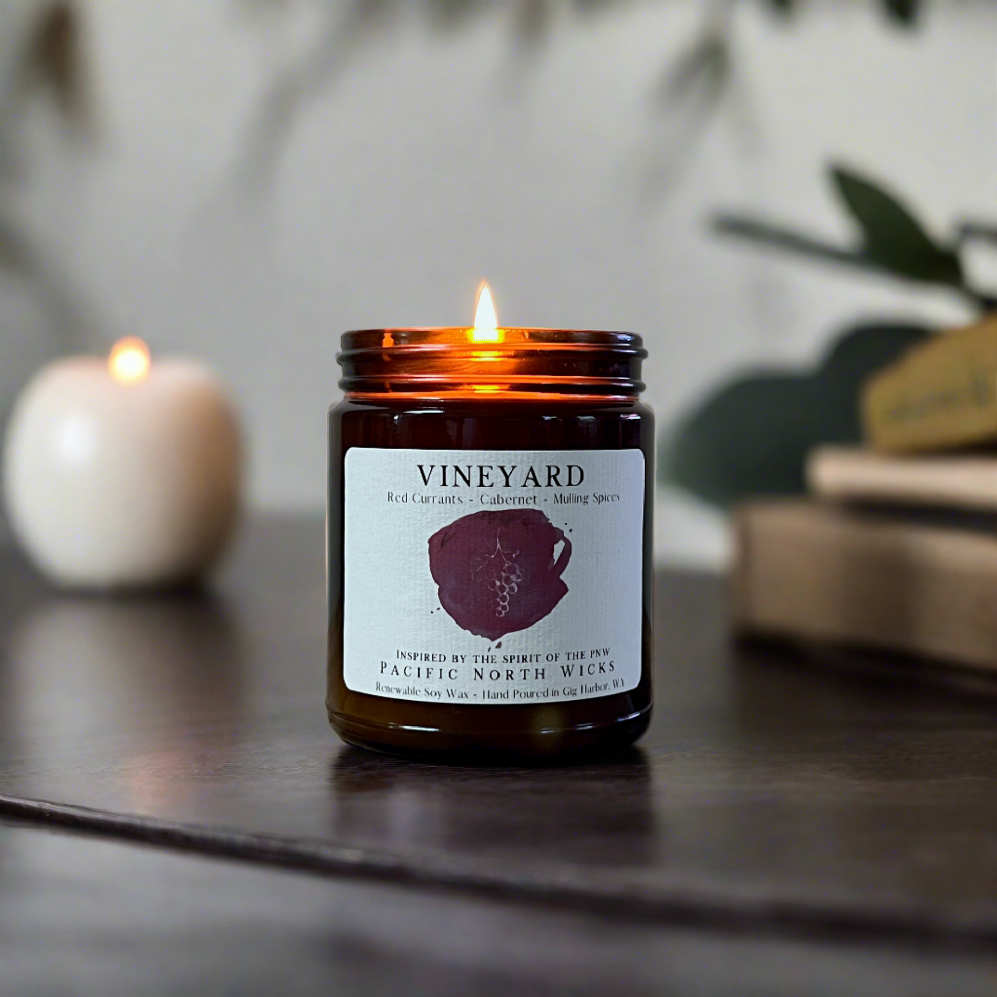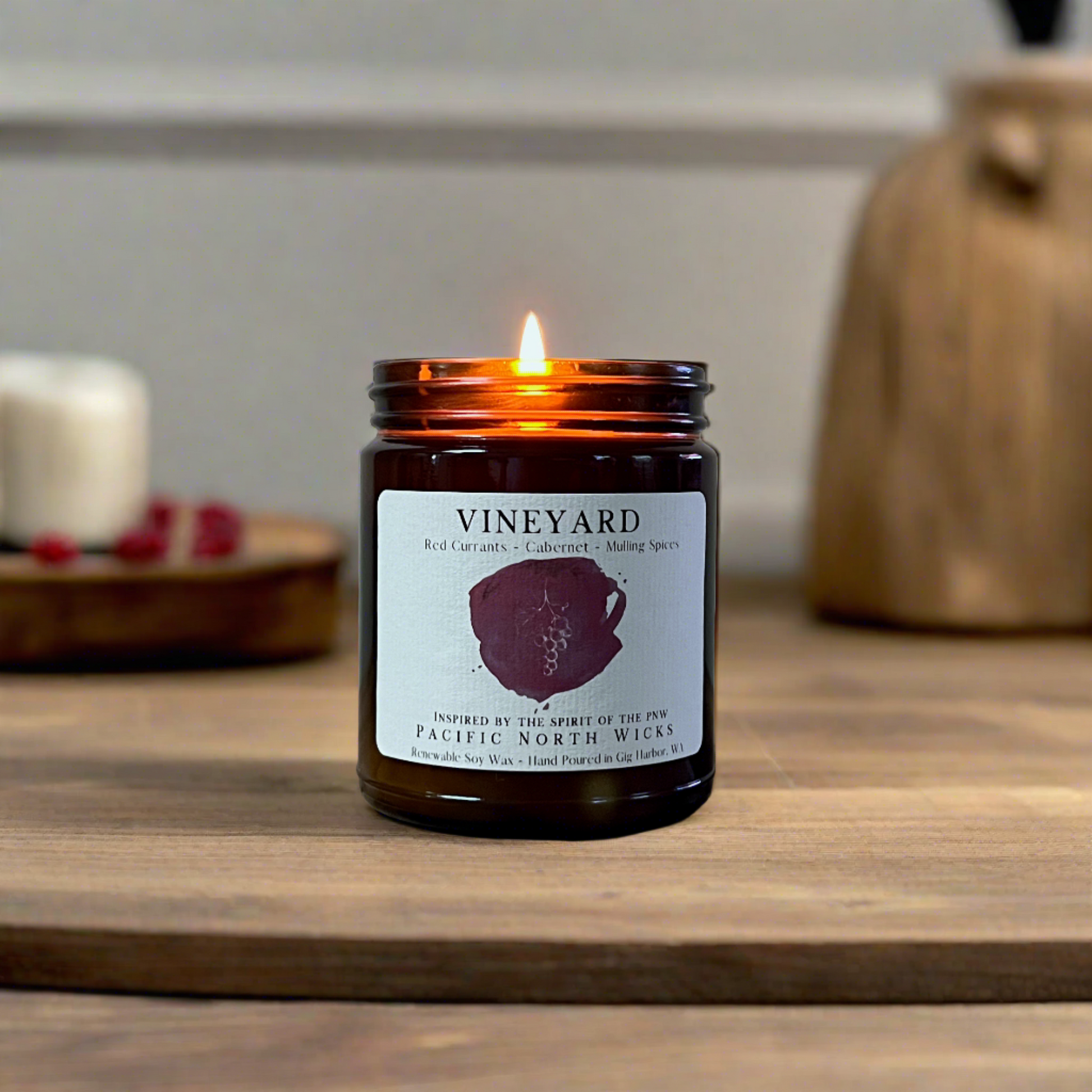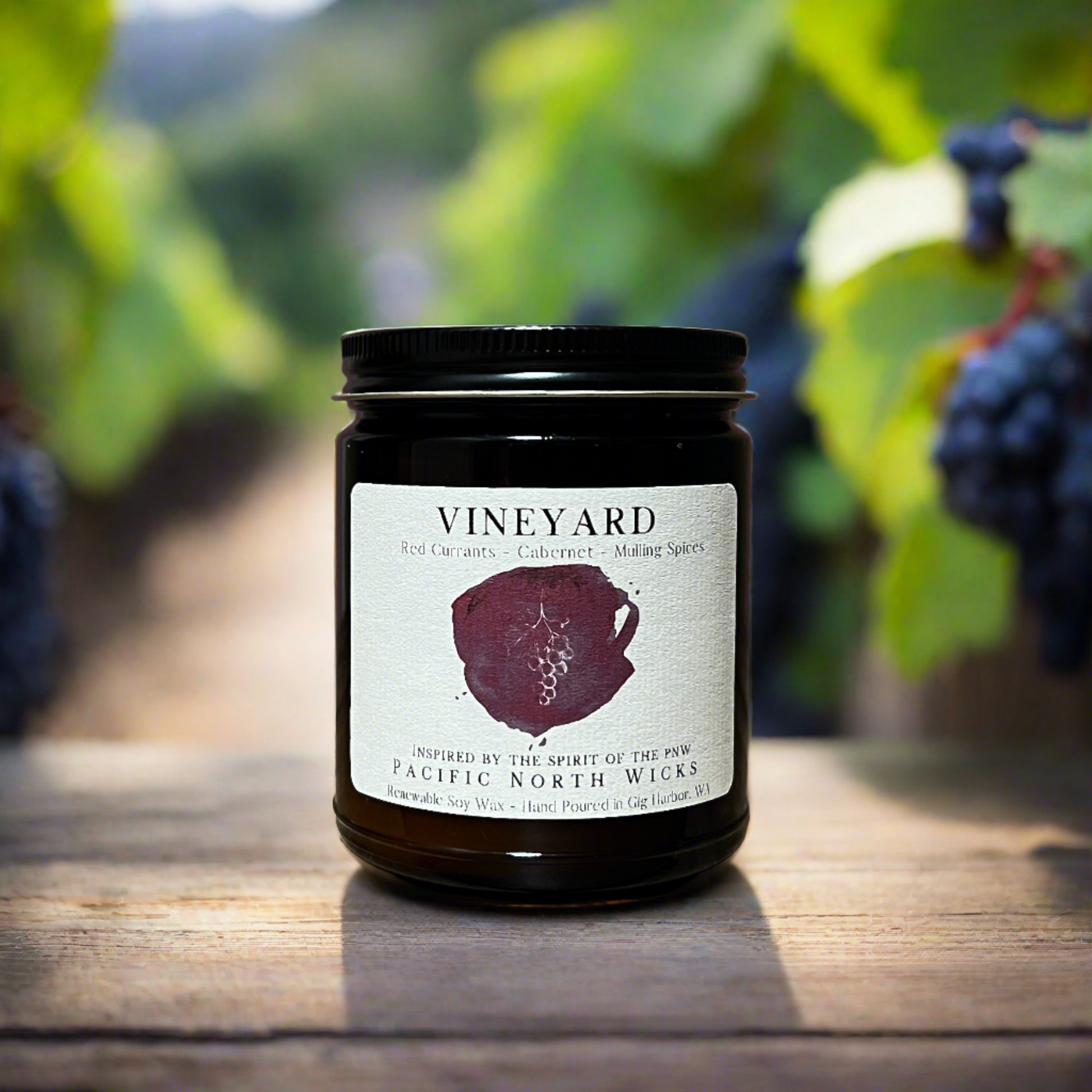 From Willamette Valley to Walla Walla, there is so much to love about the idyllic wine regions of the Pacific Northwest. Whether you prefer an Oregon Pinot Noir or a bold Washington Red, this fragrance beautifully captures the essence of the amazing red wines of the PNW. Our Vineyard candles brims with fragrant notes of red wine, currants, and mulling spices. Close your eyes, and you'll find yourself amidst rolling hills, sun-kissed vines, and the relaxed ambiance of wine country. Cheers!